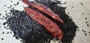 • In a heavy-bottomed pan dry roast the nigella seeds on low heat. As they start spluttering, add the red chillies and roast further.